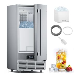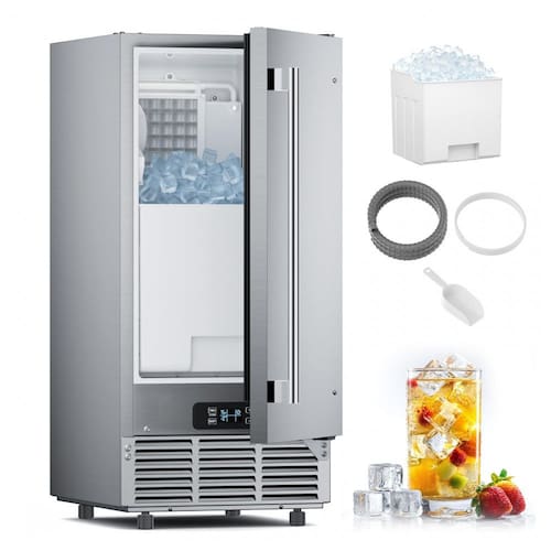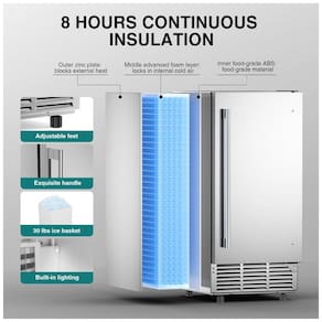 O sistema de controle inteligente inclui tela LCD touch com funções de ajuste de espessura do gelo, agendamento de produção, limpeza automática, exibição de temperatura em tempo real e alertas de falhas, além de luz LED interna no bin para acesso noturno. A porta dupla reversível (abertura esquerda ou direita) facilita o acesso, enquanto o balde de gelo removível permite limpeza total do equipamento. O sistema de drenagem por gravidade combinado com abastecimento automático de água elimina necessidade de modificações em tubulações, permitindo instalação plug-and-play. Utiliza refrigerante R290a para eficiência energética superior, com dimensões de 53 cm (profundidade) x 38 cm (largura) x 84 cm (altura), priorizando durabilidade e baixa manutenção em operações de alto volume.