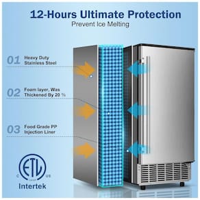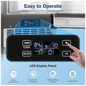 A porta com alça em aço inoxidável é reversível, permitindo instalação com dobradiças esquerda ou direita para adaptação a diferentes layouts. O painel de controle digital suporta timer de 24 horas para programação de ligar/desligar, ajuste de espessura dos cubos via tempo de congelamento e ativação de autolimpeza pelo botão "Timer Clean" mantido por 5 segundos, iniciando ciclos automáticos de higienização. O abastecimento automático de água ocorre via tubo de entrada traseiro, assegurando fluxo contínuo sem recargas manuais. Equipada com compressor de 750W e refrigerante R290a, oferece resfriamento eficiente, mantendo a forma dos cubos no bin por períodos prolongados.
