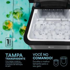 Compacta e portátil, design moderno, painel eletrônico digital, super silencioso, seletor de tamanho de gelo (pequeno ou grande), tampa em acrílico transparente, função de auto limpeza.Capacidade de armazenamento de gelo