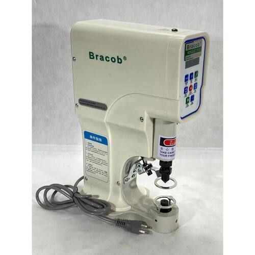 Máquina de botão de pressão BRACOB BC 818 com motor direct drive no cabeçote, painel de controle digital, contador de operação, luz de posição infravermelha (laser), luminária LED e mesa com rodinhas. Possui pedal conectado a um acionador que regula a velocidade do motor, funcionando de forma silenciosa e com economia de energia. Requer lubrificação manual antes do uso.Funções