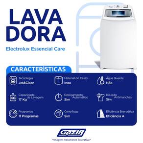 Máquina de Lavar Electrolux Essential Care 17 kg Automática Cesto Inox LED17 A máquina de lavar Essential Care da Electrolux, é a companheira certas para quem tem a rotina super corrida. Com uma capacidade excelente de até 17kg, ela vem equipada com 11 tipos de programas, oferecendo várias opções de lavagem para você, desde roupas mais leves até roupas mais sujas.