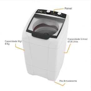 Especificações Técnicas: -Marca: Mueller -Modelo: Lavadora ENERGY 8 BCO -EAN: 7896664602338 -Cor: Branco -Tipo: Máquina de Lavar Automático -Abertura: Superior -Capacidade (Kg): 8Kg -Auto-aquecimento da Água: NÃO -Capacidade de água na cuba (Nível máximo litros): 67,8 L -Capacidade de Lavagem (Kg): 8Kg -Capacidade de Secagem (Kg): 0Kg -Cesto Removível: NÃO -Centrifugação (rpm): 750 -Consumo de energia (ciclo normal água fria kW/h): 0,24 -Desmontável: NÃO -Dispenser para Alvejante: SIM -Dispenser para Amaciante:SIM -Dispenser para Sabão: SIM -Engates p/ Mangueira: SIM -Entrada de Água: Automática -Enxágue: Automático -Enxágue Extra: NÃO -Esfregador: NÃO -Filtro para Fiapos: No Agitador -Função Apenas Centrifugar: SIM -Gabinete: Plástico especial -Grade de Proteção no Motor: SIM -Lava Edredom: Casal Soft -Mangueira de entrada de água: SIM -Motor com Protetor Térmico: SIM -Níveis de Água: 4 -Numero de Programas:11 -Pés: Reguláveis -Potência 127V (watts): 530w -Saída de Água : Automática, com sistema de reaproveitamento de água -Sistema de Lavagem: Agitação -Tampa transparente: SIM -Classificação Eficiência Energética: A -Eficiência de lavagem: 0,77 -Tensão: 127v -Dimensões (L x A x C): 56 x 100 x 62 cm -Peso: 24,6 kg -Peso Bruto: 27,2Kg