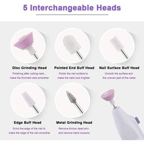 5 Cabeças: 5 cabeças intercambiáveis podem moer, lixar, cortar, lustrar, brilhar, remover gel e ículas de unhas com facilidade. Permite obter uma manicure em casa tão facilmente quanto em um salão de beleza.