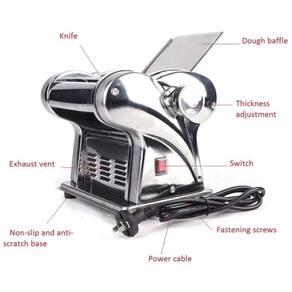 Este produto é uma máquina de prensagem totalmente nova, que pode ser usada como massa, de superfície fina de 1, e superfície de de largura. É uma prensadora de duas facas de aço inoxidável e não enferruja. O botão de ajuste possui 6 posições, a espessura da massa pode ser selecionada de 1,5 a através deste ajuste simples, a textura e o sabor da massa são alterados. Motor de 135W e com proteção automática contra superaquecimento, e confiável, muito adequado para uso doméstico. Devido à sua construção separada, a máquina é fácil de limpar e zenar seu rolo de macarrão e cortador de macarrão podem ser limpos para manter a máquina esterilizada e higiênica