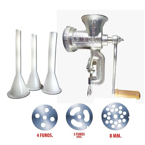 Conjunto formado por: Corpo com bucha plástica e parafuso fixador, rosca com haste e ponta quadrada, faca navalha, disco perfurado com furos de 6 mm, disco perfurado com furos de 8 mm, disco 3 furos rim , disco 4 furos, anel roscado, funil de inoxidável, porca tipo borboleta para fixação manivela comprimento 21 cm com cabo plástico.