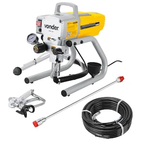 Máquina De Pintura Airless MPA 120 1,2Cv - Vonder 220vIndicada para aplicações profissionais de tintas látex, PU (poliuretano), esmalte à base sintética, à base de água, resina acrílica e tintas automotivas. Não indicada para tintas epóxi. Óleo indicado para lubrificação: óleo multiuso VONDER ou Semelhante (lubrificar sempre antes do primeiro uso ou a cada 8 horas de trabalho, colocar aproximadamente 10 gotas no compartimento de entrada de óleo).Possui pistão em aço inox, engrenagem usinada e dentes helicoidais, proporcionando maior resistência, menor ruído e maior transmissão de torque. Equipamento com excelente produtividade. DETALHES TÉCNICOS Potência do motor: 1,2 Cv / 900 WPressão máxima de saída (PSI): 3.000 lbf/pol²Vazão da pistola para pintura: 2,2 Litros/minBico padrão: 517 - Leque: abertura de 25 cm a 30 cm / espessura: 0,43 mm (0,017")Rosca da conexão da mangueira: 1/4" NPSMComprimento da mangueira.: 15 mComprimento do cordão elétrico: 2,50 mComprimento do tubo extensor: 457 mmMaterial do tubo extensor: AlumínioMassa aproximada (Kg): 15,5 kgTensão (V): 220 V~ monofásicoFrequência: 50 Hz/60 Hz ACOMPANHA - 1 Máquina de pintura- 1 mangueira com 15 m- 1 pistola de pintura (bico 517 e filtro interno malha 60)- 1 tubo extensor para pintura.