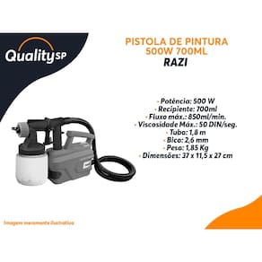 Ficha Técnica: • Tensão: 220 V • Potência: 500 W • Capacidade do Recipiente: 700 ml • Fluxo Máximo: 850 ml/min • Viscosidade Máxima: 50 DIN/seg • Tubo: 1,8 m • Bico: 2,6 mm • Peso: 1,85 kg • Dimensões: 37 x 11,5 x 27 cm
