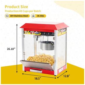 Máquina de pipoca comercial com 1300W de potência e chaleira de 0,35 gramas, que aquece rapidamente e é capaz de estourar até 60 xícaras de pipoca por lote em torno de 13,54 gramas para atender a demanda de sua loja movimentada. Possui deck aquecido para manter a pipoca fresca e uma gaveta para coletar os grãos rejeitados e facilitar a limpeza. A estrutura é durável, feita de aço laminado a frio e painéis de acrílico resistentes. As portas possuem travas magnéticas para evitar a entrada de poeira e insetos voadores. O design simples permite o controle com três interruptores Aquecedor, Agitador e Aquecedor de panela. A plataforma de aquecimento possui um tubo de aquecimento de 60 W embaixo, mantendo a temperatura e a crocância da pipoca, além de uma luz mais quente de 60 W que ilumina intensamente a pipoca. É fácil de usar, basta colocar os grãos de pipoca e o óleo na máquina, conectá la e pressionar o botão Iniciar para estourar pipoca quente e fresca de forma rápida e eficiente. A máquina de pipoca de mesa é compacta e pode ser facilmente colocada em qualquer bancada. Acompanha colher de pipoca e copo medidor. A proporção recomendada de milho para óleo e açúcar é 211. Fácil montagem e equipe profissional de atendimento ao cliente pronta para ajudar em caso de problemas.