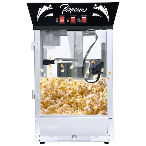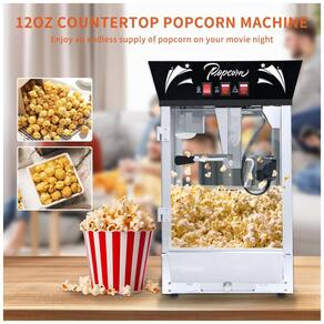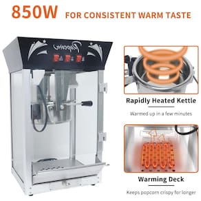 Máquina de pipoca comercial Jaxenor, estilo cinema, com capacidade de 340g, potência de 850W, fabricada em aço inoxidável, com vidro temperado, sistema de agitação integrado, plataforma aquecedora, bandeja de grãos não estourados e design de 3 interruptores.Luz indicadora de funcionamento