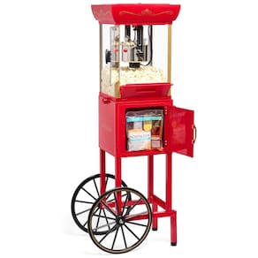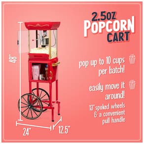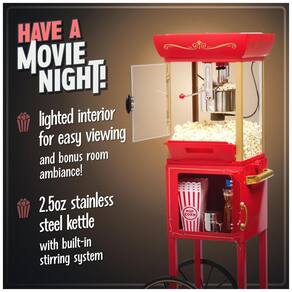 Máquina de Pipoca Nostalgia com carrinho, panela de 70g, capacidade de 2,4L, estilo vintage de cinema, ideal para uso doméstico.Luz indicadora de funcionamento