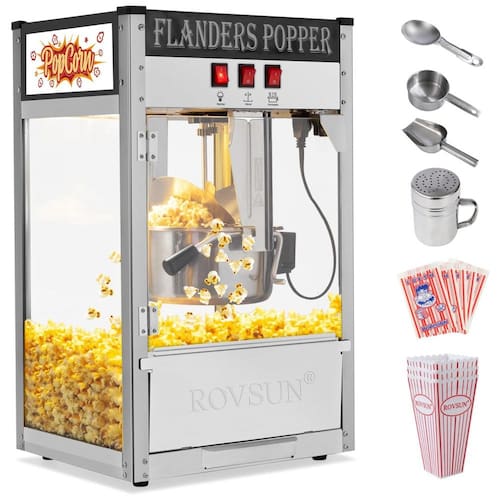 A Máquina de Pipoca de Bancada ROVSUN foi projetada para proporcionar a experiência completa de cinema em casa ou em eventos comerciais. Com capacidade de 15 litros, a caldeira permite fazer até 76 copos de pipoca de uma só vez, garantindo que não falte pipoca para todos os convidados. Com 3 interruptores de controle, é possível regular o aquecimento, a agitação e o aquecimento da caldeira separadamente, tornando a operação muito mais conveniente. Além disso, possui luz LED interna para uma visualização clara e criar uma atmosfera de cinema. A limpeza é fácil graças ao design destacável. Feita com material de alta qualidade, a caldeira de aço inoxidável 304 produz pipocas seguras para consumo. As portas de vidro temperado garantem segurança durante o uso. Com ampla aplicação tanto em casa quanto em ambientes comerciais, como cinema em casa, festas, entre outros, esta máquina de pipoca é também uma ótima opção de presente. Acompanha acessórios como pá de pipoca, colher de medição de óleo, colher de medição de milho, 3 copos de pipoca, agitador de temperos e 30 sacos.