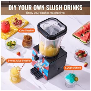 Máquina de raspadinha com tanque de 1 litro, ideal para uso doméstico, smoothies e bebidas congeladas. Possui design nostálgico e leve, com partes destacáveis para fácil limpeza. Inclui um balde de gelo e calha de alimentação para preparo de bebidas. O tanque transparente exibe as criações coloridas. O processo de preparo leva cerca de 15-20 minutos. Recomenda-se pré-resfriar os ingredientes e o balde de gelo por 30 minutos para acelerar o processo.Botão liga/desliga