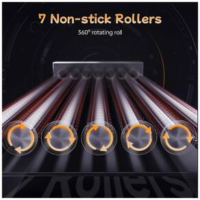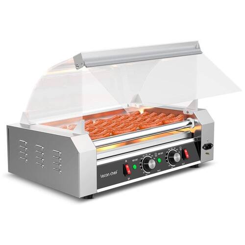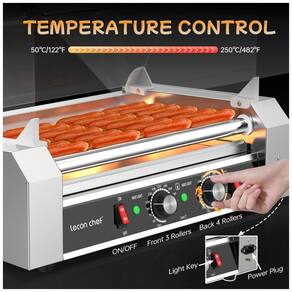 Máquina de grau 110v. A potência da máquina é 1200w. Os 7 tambores de aço inoxidável da máquina de rolo de cachorro quente podem assar mais de 18 cachorros quentes por vez. Ele pode ser girado 360 de 50 C a 250 C aqueça o cachorro quente uniformemente. Grelhar sem fumaça, a velocidade é 7r 11, min, este rolo lento é perfeito para grelhar todos os tipos de cachorros quentes, salsichas e muito mais, perfeito para lojas, barracas e em casa. Duplo Controle de Temperatura Após o interruptor de alimentação, controle de temperatura independente dos rolos dianteiro e traseiro, o controle duplo de temperatura permite o cozimento contínuo nos rolos dianteiro e traseiro, encurtando o tempo de refeição. Exibição Perfeita A máquina está equipada com luzes LED, que podem mostrar bem a comida aos clientes, independentemente do dia ou da noite, tornando a comida mais colorida e deliciosa. A tampa de proteção de vidro temperado destacável pode mostrar claramente os alimentos. Material de alta qualidade corpo de aço inoxidável de 0, de espessura, a camada interna do espelho reduz a perda de calor, o material revestido de alumínio é resistente a alta temperatura e alta pressão e a camada externa de liga de alumínio evita que a máquina arranhe. Fácil de limpar A tampa de vidro extra, bem como a tampa de poeira, podem impedir a entrada de poeira, e a bandeja removível de gordura não deixa detritos e é fácil de limpar