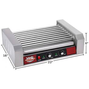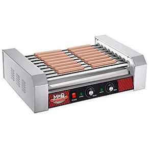 FAZ 24 CACHORROS QUENTES Com 9 rolos de aço inoxidável antiaderentes, você pode grelhar até 24 cachorros quentes de uma só vez. Este fogão elétrico possui um motor resistente que pode lidar com todos os tipos de carnes, como salsichas, pirralhos e até cachorros quentes congelados.\r\nZONAS DE TEMPERATURA DUPLA Esta panela de salsicha estilo rotisserie opera em 500 1800W e possui zonas de temperatura dupla para grelhar continuamente nos rolos traseiros, enquanto os rolos dianteiros mantêm os itens cozidos quentes e prontos para comer.\r\nBANDEJA DE GOTEJAMENTO Esta máquina de cachorro quente vem com uma bandeja de gotejamento removível de aço inoxidável, para que a limpeza seja fácil. Limpe os rolos após cada uso com água, mas nunca use produtos químicos agressivos ou palha de aço.\r\nFÁCIL DE USAR Basta ligar a máquina, colocar a carne nos rolos, definir a temperatura para cozinhar e você terá cachorros quentes macios, suculentos e estilo rotisserie prontos para servir em minutosTipo