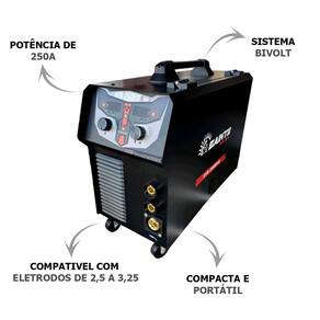 - Potência de 250A, oferecendo soldas robustas e precisas