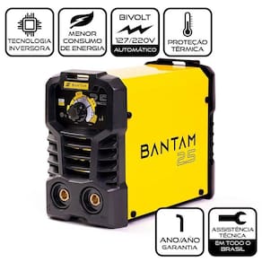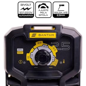 ALTO DESEMPENHO - Excelente soldabilidade e fácil abertura de arco com eletrodos E6013. A Bantam 2.5 é ideal para eletrodos de até 2,5mm; BIVOLT - Tensão de alimentação automática de 127V e 220V; PRATICIDADE - Com alça de ombro para transporte, a Bantam é compacta e cabe no armário de ferramentas, em uma mochila e até no baú da moto; PAINEL FÁCIL - Ajuste dos parâmetros de acordo com a bitola do eletrodo, tornando-a mais intuitiva e fácil de regular; ECONOMIA - Alta eficiência energética que garante o menor consumo de energia.