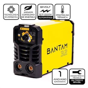 ALTO DESEMPENHO - Excelente soldabilidade e fácil abertura de arco com eletrodos E6013. A Bantam 3.2 é ideal para eletrodos de até 3,25mm; BIVOLT - Tensão de alimentação automática de 127V e 220V; PRATICIDADE - Com alça de ombro para transporte, a Bantam é compacta e cabe no armário de ferramentas, em uma mochila e até no baú da moto; PAINEL FÁCIL - Ajuste dos parâmetros de acordo com a bitola do eletrodo, tornando-a mais intuitiva e fácil de regular; ECONOMIA - Alta eficiência energética que garante o menor consumo de energia.