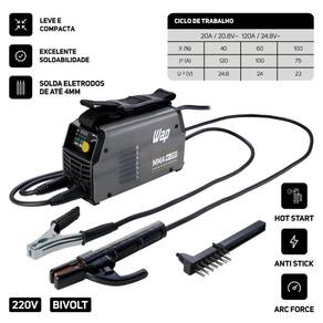 Essa inversora leve e compacta apresenta baixo consumo de energia, possui função VRD (dispositivo de redução de tensão a vazio nos terminais de saída), garantindo maior segurança ao operador contra riscos de choque elétrico e display digital que permite regulagens mais precisas e sensor de sobreaquecimento. Permite a soldagem de materiais ferrosos e suas ligas, aço-carbono, aço inox, cobre, latão, entre outros. Solda eletrodos AWS E6013 de até 4mm dentre outros até 3,25 mm.