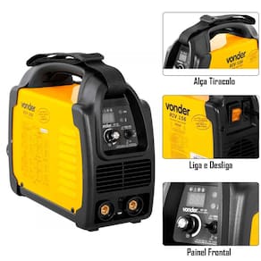 - Fator de trabalho: 127 V~: 130 A - 20% / 75 A - 60 % / 60 A - 100 % / 220 V~: 150 A - 20% / 85 A - 60% / 70 A - 100%;
