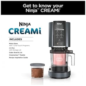 O que está incluído: Base do motor com motores de acionamento duplo, Pá Creamerizer, (1) Pinta de 473 ml CREAMi com tampa de armazenamento, Tigela externa e tampa para acondicionar a pinta durante o processamento.