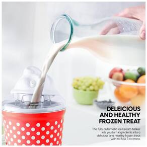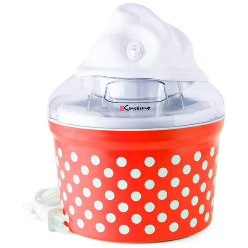 Máquina de sorvete manual Euro Cuisine com capacidade de 1,5L, ideal para preparar sorvetes, sorvetes e iogurtes congelados em 30 minutos. Design divertido com cores vibrantes e formato de sorvete.Bowl de congelamento