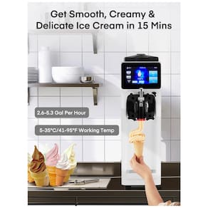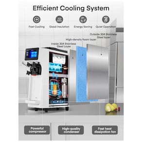 Máquina de sorvete soft comercial com compressor de alta performance, refrigeração eficiente e baixo ruído. Opera em temperaturas ambientes entre 5°C e 35°C. Congelamento rápido em 12 minutos, lotes subsequentes em até 6 minutos. Capacidade produtiva de 10 a 20 litros por hora. Possui tecnologia de pré-resfriamento e função de autolimpeza automática via tela LCD sensível ao toque. Função 'deep puffing' para aprimorar aspecto visual e textura. Design em aço inox 304 resistente, alça ergonômica, sistema eficiente de ventilação e bandeja coletora removível.Bowl de congelamento