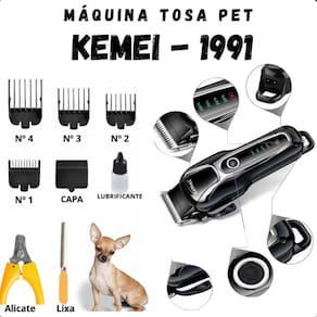 Máquina de tosa kemei km-1991 portátil Descrição do anúncio: A máquina de tosa pet bivolt kemei km-1991 é ideal para tosar animais de pequeno e médio porte de forma eficaz e segura. Equipada com lâmina de aço inoxidável, possui tela lcd digital para monitorar a bateria e opera silenciosamente, garantindo conforto para o pet. Conteúdo da embalagem: Máquina km-1991 Fonte bivolt 4 pentes guia 3mm, 6mm, 10mm, 13mm Bisnaga com silicone Pente Cortador de unhas Lixa Manual do usuário Características: Sem fio Tensão bivolt Potência de 5w Lâminas de aço inoxidável ajustáveis 0,5 mm a 1,0 mm Motor de alta velocidade Carregamento rápido 3 horas Autonomia de até 120 minutos 4 pentes guia 3mm, 6mm, 10mm, 13mm Especificações: Material: abs de alta qualidade Tela lcd Sistema de corte r-shape Tempo de carregamento: 3 horas Tempo de uso: até 120 minutos Tensão de entrada: 5v Corrente: 1000ma Principais perguntas sobre o produto e respostas: 1 é indicada para pets de médio e grande porte Sim, eficaz para animais de qualquer tamanho. 2 o produto é resistente Sim, feito com materiais de alta qualidade e durabilidade. 3 tempo de carregamento da bateria Aproximadamente 3 horas. Marca: Não Informado