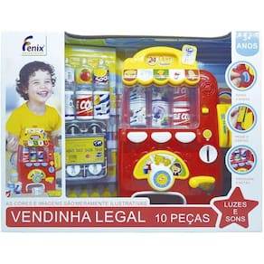 Venha brincar de mercadinho com a Vendinha Legal. Ela emite luz e sons, você pode inserir uma moeda, passar um cartão e depois é só apertar o botão e pegar o seu suquinho. Manter longe do alcance de crianças menores do que 4 anos, por conter partes pequenas, que podem ser consumidas.