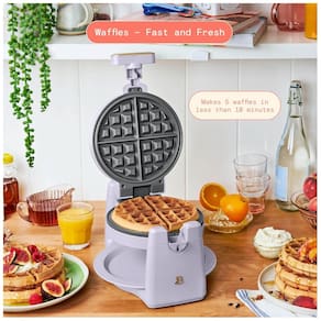 A máquina de waffle belga giratória Beautiful Rotating Belgian Waffle Maker 19451 foi projetada para preparar waffles redondos com cerca de 2,5 cm de espessura, utilizando um sistema de rotação que distribui a massa de forma uniforme sobre as chapas. O conjunto trabalha com potência de 1000W, possui carcaça metálica com acabamento fosco na cor white icing e chapas internas com revestimento antiaderente sem PFOA e PFOS, além de bandeja coletora removível que auxilia na retenção de excesso de massa.