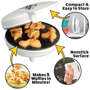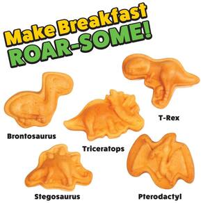 Máquina de Waffle CucinaPro para fazer waffles em formato de dinossauros. Possui revestimento antiaderente, design compacto para fácil armazenamento e receitas inclusas.Porta-fio