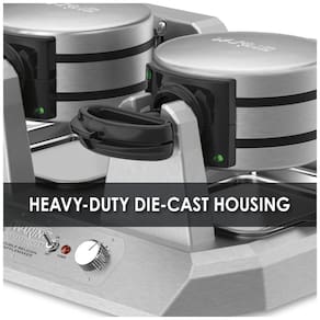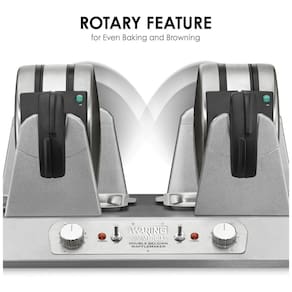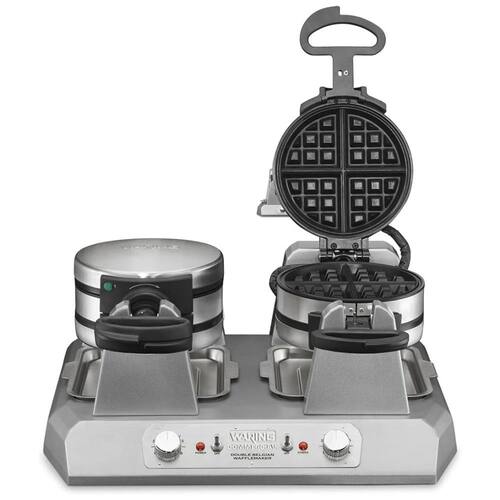 Modelo WW300BX Asse até 120 waffles belgas por hora O recurso rotativo garante cozimento e douramento uniformes Placas antiaderentes permitem fácil remoção de waffles e limpeza rápida Controles de temperatura ajustáveis e independentes permitem cozinhar diferentes massas separadamente, ao mesmo tempo Tempo Você pode fabricar waffles belgas de até 120, 1 polegada de espessura, marrom dourado por hora com esta máquina de waffles belga dupla lado a lado da Waring . É perfeita para lanchonetes, cafés e qualquer outro estabelecimento de serviços alimentícios. A carcaça para serviço pesado, fundida sob pressão, os elementos de aquecimento incorporados e um recurso rotativo garantem resultados uniformes e limpeza rápida. Modelo WW300BX Asse até 120 waffles belgas por hora O recurso rotativo garante cozimento uniforme e placas antiaderentes douradas permitem fácil remoção de waffles e limpeza rápida Controles de temperatura ajustáveis e independentes permitem cozinhar diferentes massas separadamente, ao mesmo tempo A carcaça fundida resistente é durável e fácil de limpar A bandeja coletora removível e lavável na máquina de lavar louça limpeza rápida e fácil