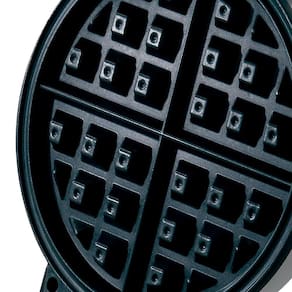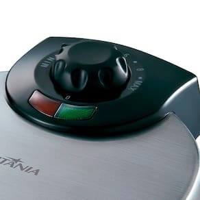 Máquina de waffle com 850W de potência, placas antiaderentes que tostam os dois lados por igual, base antiderrapante, alça fria e controle ajustável de temperatura. Prepara até 4 waffles por vez e pode ser guardada na posição vertical.Porta-fio