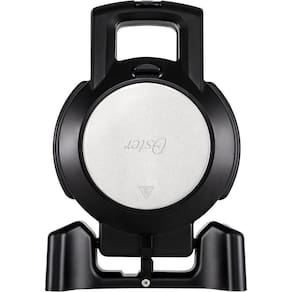 Máquina de Waffle Oster Perform 180 com alça isotérmica, acabamento em aço inox e chapa 100% antiaderente. Permite girar a massa 180° para um preparo uniforme.Porta-fio