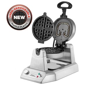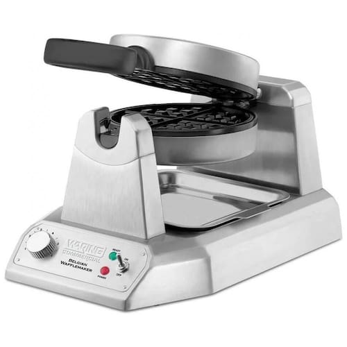 Máquina de Waffle rotativa Waring WW180X, produz até 25 waffles belgas por hora, com 1200W de potência, controle preciso de temperatura e placas antiaderentes.Porta-fio