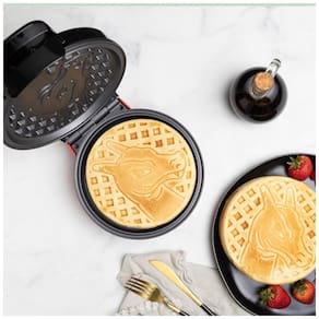 Todos os fãs de Pokémon vão adorar a Máquina de Waffle Charizard da Uncanny Brands. Transforme seu café da manhã com a energia do universo Pokémon usando esta máquina de waffles antiaderente. Seja para waffles dourados e crocantes ou macios e dourados, o termostato regulado e a tampa com peso garantem um aquecimento uniforme, enquanto as luzes indicadoras duplas ajudam a saber exatamente quando adicionar a massa e quando os waffles estão prontos.