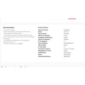 É ideal para a confecção de diversos artigos e acabamentos como bainhas, rebatimento de costuras ou em detalhes estéticos de camisetas, calças, bermudas, vestidos, acessórios e até mesmo produtos de decoração. Atende segmentos têxteis variados como moda masculina, feminina e infantil, fitness, moda íntima, sleep wear, moda praia e etc. Características: • Luz de LED • Alta produtividade com excelente performance; • Motor Direct Drive 550W / 110v • Lubrificação automática através de bomba de óleo, melhor lubrificação em alta rotação e maior durabilidade da máquina; • Versatilidade de trabalhos com a instalação de dispositivos diversos; • Protetor de vista conforme NR 12. Ficha Técnica: Tipo de Costura Cobertura Bitola 6.4 mm Tipo de Ponto Corrente Altura do Calcador 5 mm Categoria de Materiais Gerais Tipo de Transporte Simples N° de Agulhas 3 Tipo de Agulha UYX128GAS #10 Tipo da Base Plana N° de Linhas 5 Tamanho do Ponto 1.6 mm ~ 4.2 mm Regulagem do Ponto Botão Lubrificação Automática Motor Direct Drive Estante Com Rodinhas e Freio Velocidade Máxima 4800 RPM