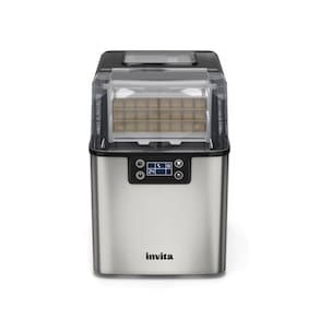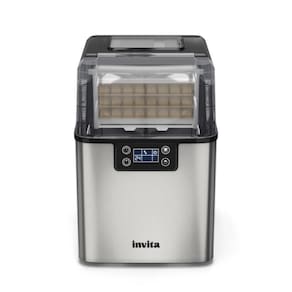 Máquina de gelo portátil com design versátil, acabamento em aço inoxidável prata, produz 20 kg de gelo por dia (24 cubos a cada 20 min), com 3 opções de tamanho de gelo (pequeno, médio, grande). Pode ser abastecida manualmente ou automaticamente via rede hidráulica. Possui cesto de armazenamento para 1,2 kg de gelo e reservatório de água de 3,2 litros. Comando soft touch.Capacidade de armazenamento de gelo