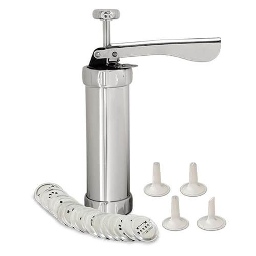 Máquina manual para biscoitos Brinox, linha Verona, com 20 formatos e 4 bicos para decorar. Design clássico e fácil de usar.