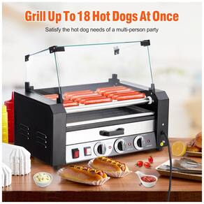 Este grelhador de salsichas profissional é perfeito para fazer cachorros quentes em barracas de comida, reuniões familiares e churrascos. Possui 7 rolos antiaderentes que podem adicionar até 18 cachorros quentes por vez. Além disso, é projetado para uma variedade de cachorros quentes, salsichas, almôndegas e muito mais. A tampa de vidro temperado transparente pode ser removida e instalada livremente para impedir a entrada de poeira. Com uma grande base antiderrapante para fácil acesso à grelha, o tambor giratório ininterrupto garante um cozimento uniforme de cachorros quentes sem complicações. Os mostradores duplos de temperatura permitem ajustar facilmente a temperatura de cozimento dos rolos dianteiro e traseiro para um máximo de 250ºC. Construído com um corpo de aço inoxidável que nunca enferruja, juntamente com uma bandeja coletora de gordura removível, garantindo que a sujeira seja mantida sob controle. Capaz de cozinhar e grelhar em praticamente qualquer local, este design poderoso e compacto evita a bagunça e o incômodo de usar uma churrasqueira a gás convencional de tamanho normal. A churrasqueira para cachorro quente vem com um cabo de alimentação padrão dos EUA de 1350 Watts e 110 volts e base emborrachada antiderrapante para maior segurança operacional, com certificação ETL para garantia de qualidade.
