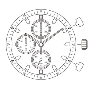 Máquina para relógio cronógrafo, sem calendário com ponteiros laterais no 6, 9, 12. Na Fornitura Central você encontra Mecanismo Para Relógio Miyota OS30 com funções na posição 6hrs segundos , na posição 9hrs Cronógrafo das horas , na posição 12hrs Cronógrafo dos minutos e cronógrafo de segundos central. Marca: Miyota Ean: 7908289211526