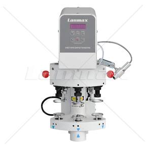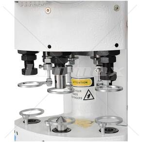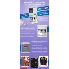 Máquina de pregar botões e ilhós eletrônica com 3 cabeças. Painel de comando digital. Motor servo eletrônico. Dispensa compressor. Pressão de estampagem: 1500Kg. Acompanha mesa e motor.Alça retrátil