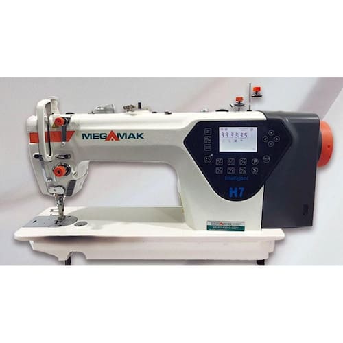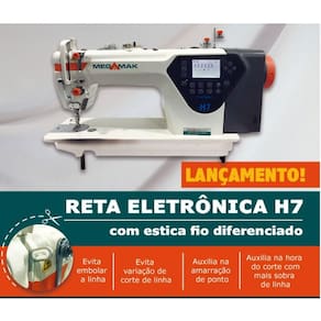Maquina de Costura Reta Eletrônica Megamak com motor Direct Drive, lubrificação automática e lançadeira pequena. Possui corte de linha, levantamento de calcador, retrocesso inicial e final e parada de agulha automáticos, diferenciais que aumentam a velocidade da operação. Utilizada na confecção em geral como malha, lingerie, moda praia, jeans, entre outros.