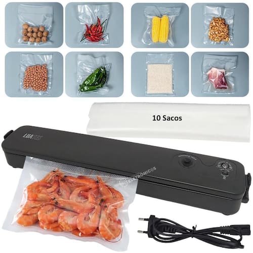 Máquina Seladora à vácuo foi desenvolvida para que os seus alimentos durem até 8x mais, e que mantenham eles mais saborosos e frescos por muito mais tempo. De fácil manuseio e que garante a qualidade dos alimentos durante a sua selagem. Leve e portátil podendo ser transportado para onde quiser. Ideal para a selagem dos alimentos, Proteja além dos alimentos, seus documentos, fotos e joias com a máquina seladora à vácuo, a mais completa do mercado.ATENÇÃO PARA UTILIZAÇÃO CORRETA:Utilize somente sacos destinados a selagem a vácuo;Após ligar a maquina, espere 30 segundos para ela esquentar e então a utilize;Depois de cada operação de selagem aguarde de 1 a 2 minutos para utilizar novamente;Não coloque comida em excesso dentro do saco. Não coloque mais que 3/4 do volume máximo;Não molhe as extremidades do saco, pois quando molhado, o processo de vedação é dificultado;Caso a operação seja frequente, em um curto período de tempo, o saco pode derreter devido ao alto aquecimento da máquina.INFORMAÇÕES TÉCNICAS:Marca: LuatekModelo: LK5099Material: PlasticoPotência: 90wVoltagem: 110v - 220v BivoltTamanho do produto: 36,5cm x 4,2cm x 6,4cmTamanho do cabo: 82cmPeso: 375gCor: PretoCONTEÚDO DA EMBALAGEM:1 Seladora embaladora LK50991 Cabo de energia10 Sacos plásticos1 Manual1 Caixa/embalagemGarantia:Confira O Produto No Ato do Recebimento, Garantia Apenas Contra Defeitos De Fabricação Diretamente Com Fabricante/Fornecedor. Marca: Luatek Dp