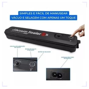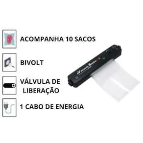 Máquina Seladora Alimentos Vácuo 10 Sacos Embalagens Bivolt - Possui um temporizador de selagem por calor controlado, totalmente automatizado.- Perfeita para alimentos, ajuda reduzir a deterioração em até 5 vezes, os mantendo muito mais frescos.-pode ser utilizada para armazenar diversos outros tipos de itens, como: roupas, acessórios, joias, itens colecionáveis, etc...- Uma ótima opção de ferramenta para empresas, donas de casa, e pessoas preocupadas com a durabilidade de seus produtos.- Assista ao vídeo de demonstração, na última imagem desde anúncioESPECIFICAÇÕES:Material: ABSBivoltTamanho: 36 x 6,5 x 4 cmPeso: 600gForma de trabalhar: ManualVelocidade de vedação: 3 a 8segLargura Máxima de selagem: 15 cmEspessura do filme: 5-13Limite da pressão a vácuo: 0.08 MPaCARACTERÍSTICAS:- Não precisa de clipes, fitas ou bandas de borracha;- Design feito para economizar espaço, perfeito para bancada;- Selagem a vácuo totalmente automática;- Projeto de bomba poderosa garantindo a extração máxima de ar;- Tira de calafetagem para um selo forte, seguro;- Economize tempo preparando refeições com antecedência;- Elimina a possibilidade de queimaduras no congelador, reduz a deterioração e resíduos;- Protege das bactérias e fungos;- Selamentos hermético, mantendo o seu alimento fresco;- Pode manter os seus suprimentos secos enquanto estiver acampando e viajando;- Previne a prata de ficar preta;- Protege fotos e documentos;- Ideal na cozinha, escritório, oficina, camping, jardinagem, RV, barco;- Serve para todas as suas comidas favoritas: chips, café, batata, passas, arroz e etc....FUNÇÕES:1. Semi-embalador a vácuo 2. Embalagem a vácuo e vedação;3. Pode ser parado durante o uso;4 Função de anti-sobrecarga;5. Fácil de desmontar e limpar;Itens Inclusos:1x Seladora a Vácuo10x Sacos Texturizados apropriados para uso na Seladora1x Manual de instruções 1x Cabo para Carregamento