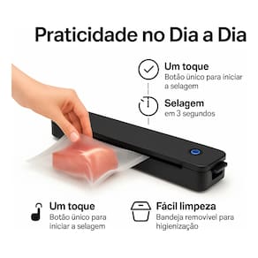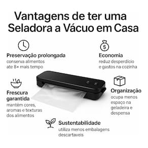 Benefícios: Maior conservação dos alimentos: reduz oxidação e crescimento de micro-organismos, aumentando a durabilidade em até 5 vezes. Organização eficiente: ideal para porções individuais, marmitas e congelamento. Economia de espaço: mantém a geladeira e o freezer mais organizados. Praticidade: operação rápida e intuitiva, sem necessidade de experiência. Estilo e funcionalidade: design elegante que combina com qualquer cozinha. Evita odores e contaminações cruzadas.