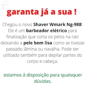 Chegou o novo Shaver Wmark Ng-988 Ele é um barbeador elétrico para finalização que corta os pelos na raiz deixando a pele bem lisa como se tivesse passado Gillet ou navalha. Pode ser utilizado também para depilar partes do corpo e cabeça.Modelo: NG-988 VerdeDuas cabeças reciprocas e flutuantes.Speed velocidade do motor: 7000 rpm.Housing alojamento transparente completo.Interface tipo-c interface de carregamento.- Bateria de lítio: 2x600mah,1.5 horas de carga completa para 120 minutos de uso.Display com led exibição de energia da bateria restante.Cover capa destacável com grade, conveniênciaPara limpar e substituir a cabeça da gillet.Barbeador, maquininha de barbear, barbeador eletrico, kemei, aparelho de barbear eletrico, maquina shaver, barbeador titanium, maquina de barba, barbeador elétrico, shaver, Barbeador vintage t9, barbeador kemei, bladerpro barbeador, shaver kemei, mini barbeador eletrico, aparelho barbear eletrico, maquina de fazer barba, barbiasdor eletrico, Barbeador fusion pro, barbeador titanio, wmark ng-988, shaver wmark ng-988Especificações Técnicas:Itens Inclusos:1- Maquina NG9881- Cabo USB Type-C para o carregamento1- Escova de limpeza.1- 1 Saquinho de veludo para guardarRegistro Inmetro Ocp 0151