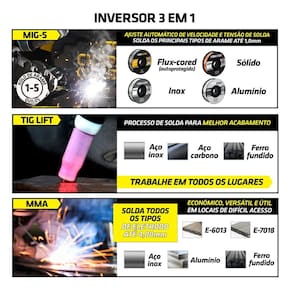 Indutância Eletrônica MIG (Permite o ajuste do fluxo magnético, proporcionando menos respingos na solda);