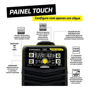Para o processo mig-mag, é possível soldar com gás e sem gás, função spot, indutância eletrônica, função burbank e a sinergia eletrônica facilita a operação do equipamento. Conta com painel de led que garante maior conforto e precisão ao soldador com informações claras e vivas, mesmo em ambientes escuros.