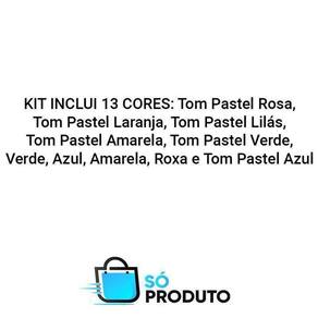 Kit inclui 13 cores: tom pastel rosa, tom pastel laranja, tom pastel lilás, tom pastel amarela, tom pastel verde, verde, azul, amarela, roxa e tom pastel azul
