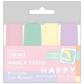 Marca Texto Tilibra Happy 4Un. O Marca-Texto Mini Happy é prático para uso diário, possui ponta chanfrada e cor pastel, sendo perfeito para marcar e destacar trechos importantes de um texto de uma forma mais sofisticada. Ideal para ser Utilizado na escola, escritório e em casa. Detalhes Alta qualidade Cor: Pastel Maior resistência e durabilidade Não toxico Ponta: chanfrada Produto certificado: INMETRO Quantidade: 4 Traço 1mm / 4.5mm Formato: 27mm x 105mm Ean: 7891027313036